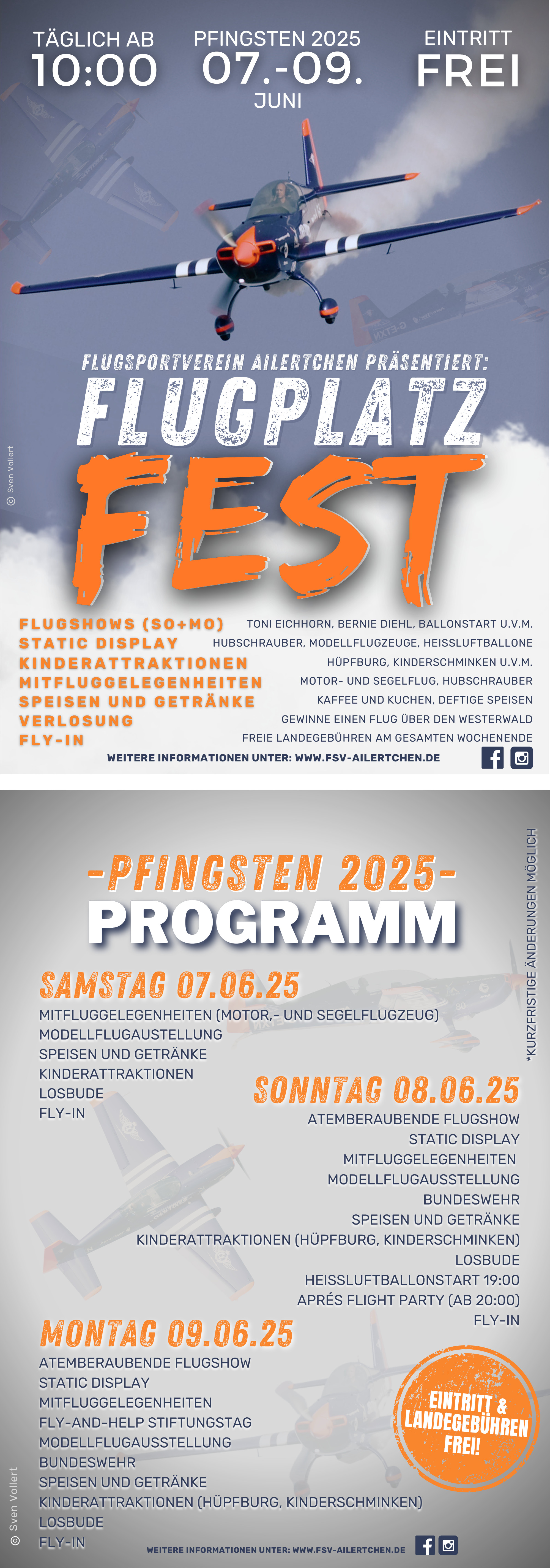 Pfingsten 2025 wird zu einem unvergesslichen Erlebnis – sei dabei beim alljährlichen Flugplatzfest des Flugsportvereins "Glück Auf" Ailertchen e.V.! Ein Wochenende voller aufregender Highlights und jeder Menge Spaß wartet auf dich und deine Familie!